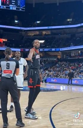 比赛期间曾发生了有趣的一幕,火箭球星杜兰特在一次罚球期间来到场边,他走到灰熊当家球星莫兰特的父亲Tee的身旁对其进行了嘲讽,杜兰特说道:“你儿子不想待在这里了,我们知道这是你(在这儿的)最后一个周末。好好享受吧。”