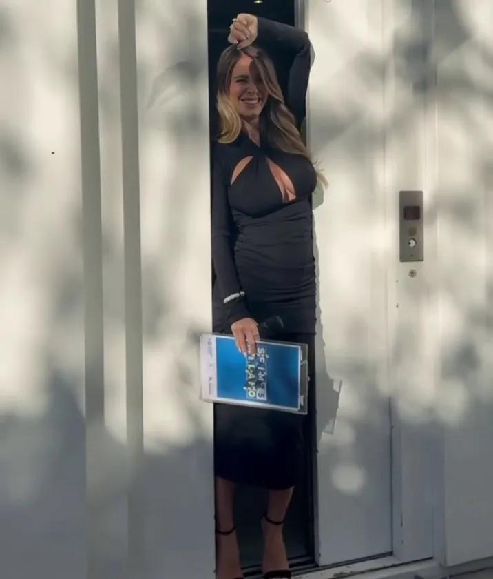 34岁的迪莱塔-莱奥塔穿着一件迷人、大胆的黑色连衣裙摆拍了多张照片,然而拍摄过程并非完美——当她正在敞开的电梯门前摆造型时,意外瞬间被镜头捕捉:电梯门突然关闭撞到她,迪莱塔被撞到后忍俊不禁,自己也被这滑稽场面逗乐,电梯门在她身上停留片刻,最终她用手肘顶开才解围。