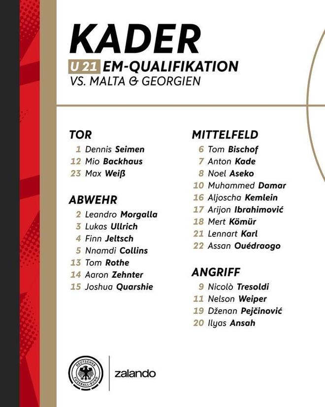 德国U21大名单:17岁卡尔入选,比朔夫、阿尔扬-伊布在列